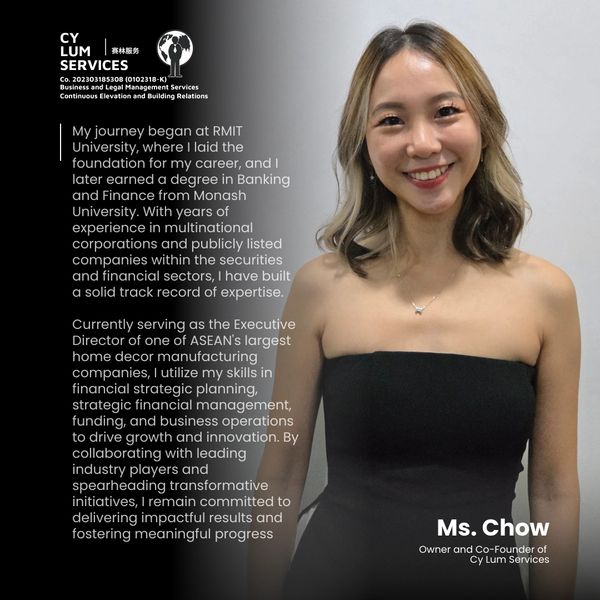 Ms. Chow, the founder of Cy Lum Services, and serves as the director for several manufacturing and distribution companies in Malaysia's home furnishing and décor industry. Her leadership and management form the cornerstone of our Company's success